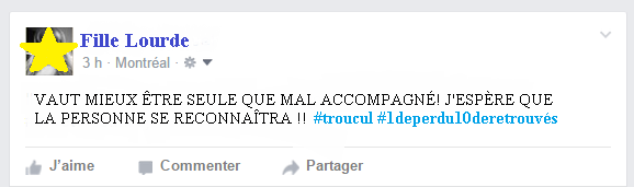 En fait, j’ai réalisé dernièrement que je ne me suis jamais fait plaquer (attendez avant de me tirer des roches) ou sinon c’était par des fréquentations. Des relations où je n’étais pas impliquée suffisamment, disons, pour que ça nécessite que je prenne une journée de maladie pour m’en remettre.